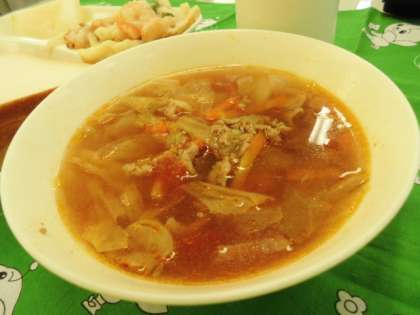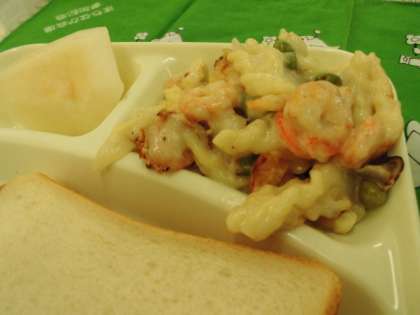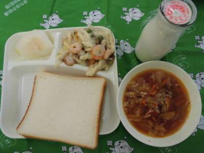 献立は、えびグラタン、トマトスープ、なし(二十世紀)、パン、牛乳でした。