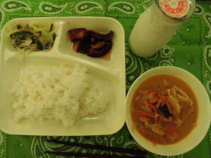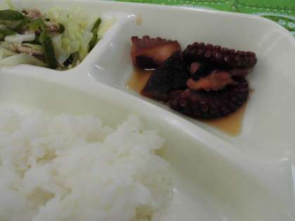 献立は、たこのやわらか煮、みそ汁、野菜いため、ごはん、牛乳でした。