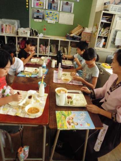 子どもたちから質問が出たり、いろいろな話題で盛り上がったりしながら給食をいただきます。