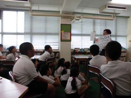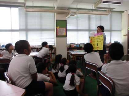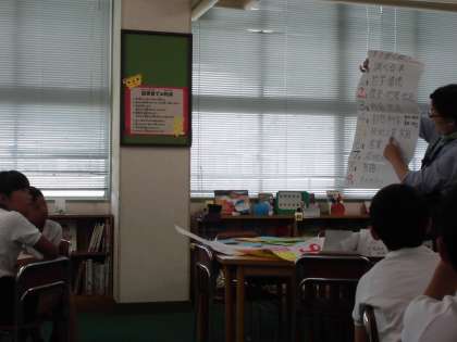図書館補助員の昌山先生には、毎週金曜日に本校図書館に来て図書館ボランティアの方ととともに図書の紹介や整理、「図書館、一日、あいてんでー」の開催など、図書館教育の一端を担っていただいていております。一人でも多くの子どもたちにもっと本を好きになってもらったり、図書館の良さをわかってほしいという願いがあります。