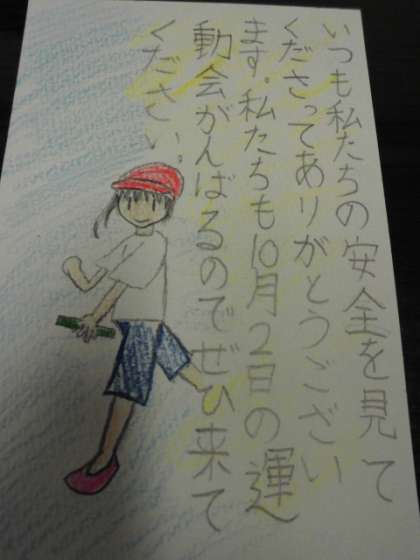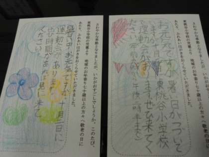 でも、子どもたちは、一枚一枚それぞれの学年に応じて心を込めてはがきを書きました。イラストをそえる子どももいました。運動会への案内もさせていただいておりますので、多数の皆様のご来場を祈念しております。