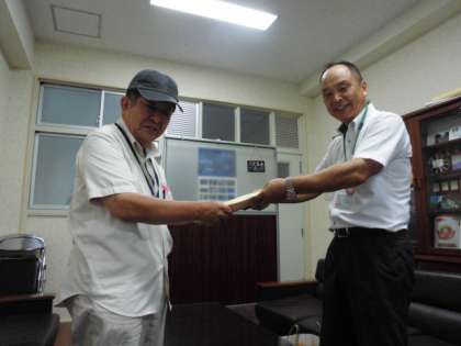 昨日学校ホームページで紹介した子どもたち、教職員で仕上げた700通を超えるはがきを、東桃谷地域の老人クラブ会長山本様に東桃谷小学校を代表し校長室にてお渡ししました。