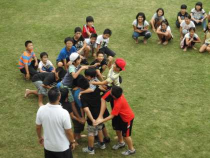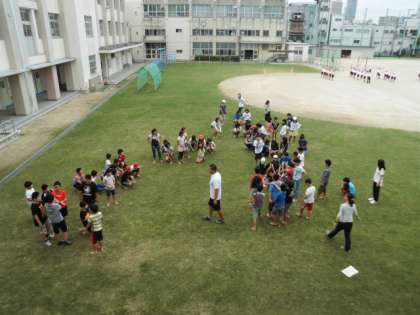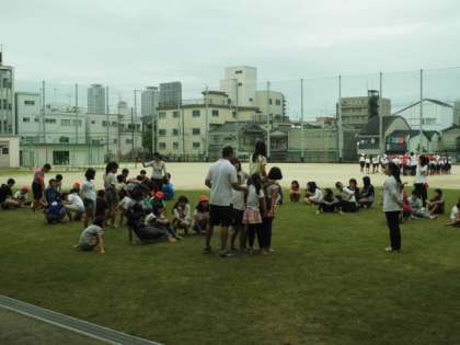 芝生で、5・6年生が騎馬戦の騎馬の組み方からルールの確認をしていました。