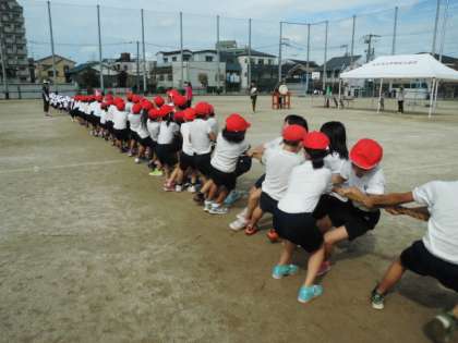 運動場では、1・2・3年生の団体競技「綱引き」の練習をしていました。