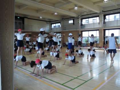 講堂では、5・6年生の団体演技「表現運動〜私たち5・6年生の力」(ソーラン節・集団行動・組体操)の練習をしていました。練習にも、熱を帯びてきました。