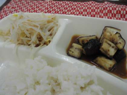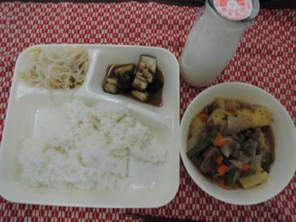 献立は、肉じゃが、焼きナスのみそだれかけ、もやしのゆずの香あえ、ごはん、牛乳でした。