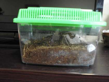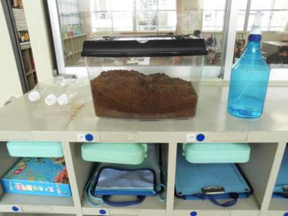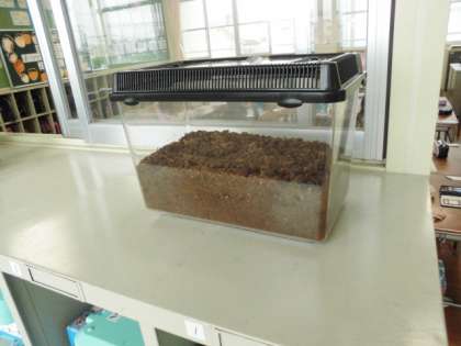 先日いただいたカブトムシ。1年生の教室前廊下と校長室で大切に育てています。