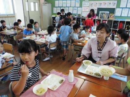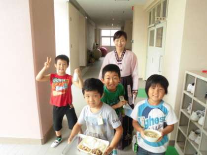 今日は、2年1組でソムセンニムとの交流給食がありました。