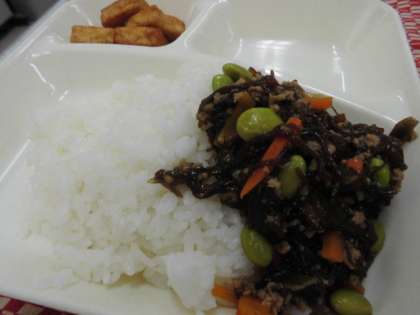 献立は、もずくと豚肉のジューシー、五目汁、あつあげのしょうがじょうゆかけ、牛乳でした。