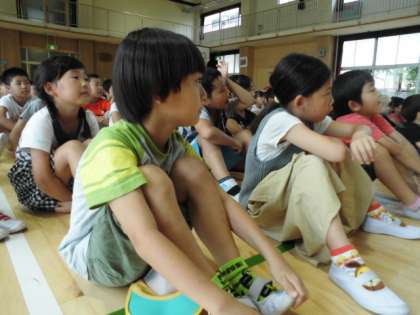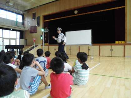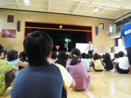 交通安全指導の準備が終わった頃に雨が降り始め、運動場から講堂へ場所が変わりました。また、低、中、高学年ごとに実施する予定でしたが、1・2・3年生と4・5・6年生に分けて実施しました。