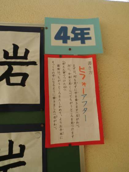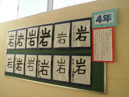 階段を上がると踊り場の掲示板に4年生の書写作品が掲示してありました。