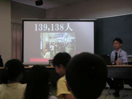 駅構内の線路に倒れている人や危険を知らせる時の「非常ボタン」や天王寺駅の乗降者数を教えてくださいました。予想よりあまりに多くてビックリ!6桁の数字を書くのに少し大変でした。