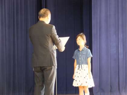 児童集会後に第32回大阪市小学校児童絵画・版画展の表彰状を授与しました。