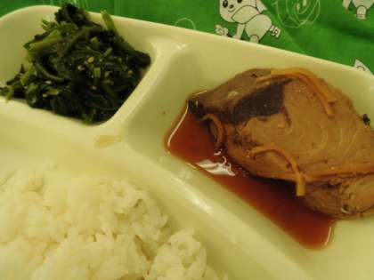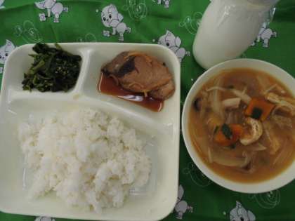 献立は、なまりぶしのしょうが煮、みそ汁、ほうれん草のごまあえ、ごはん、牛乳でした。