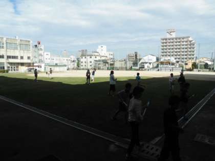 その前に4年生が理科の水鉄砲を使った活動を芝生で行いました。