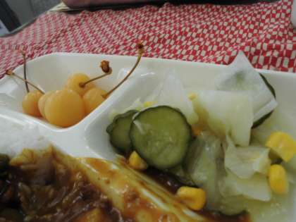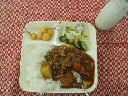 献立は、ポークカレーライス(米粉)、野菜サラダ、サクランボ(缶)、牛乳でした。