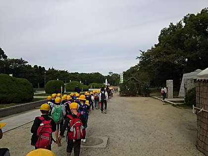 大阪城公園に着きました。どんぐりを拾う場所に向かっています。