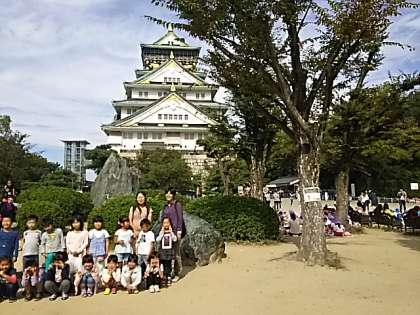 大阪城をバックに記念撮影をしているところです。