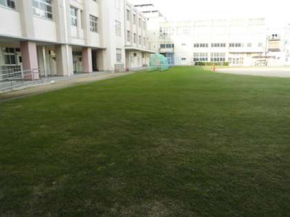 養生期間中の芝生ですが、冬芝の鮮やかな黄緑色の芽が出てきています。