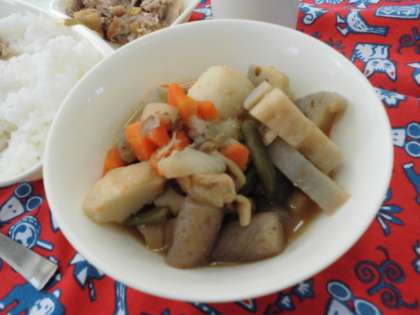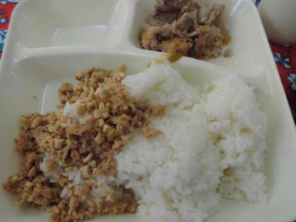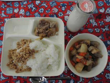 献立は、豚肉のねぎだれかけ、鶏肉とレンコンの煮物、ツナ大豆そぼろ、ごはん、牛乳でした。