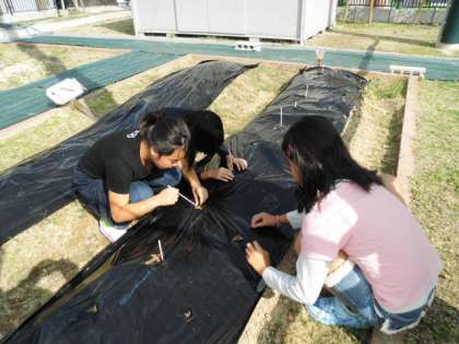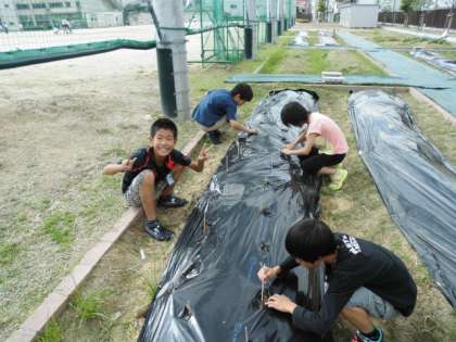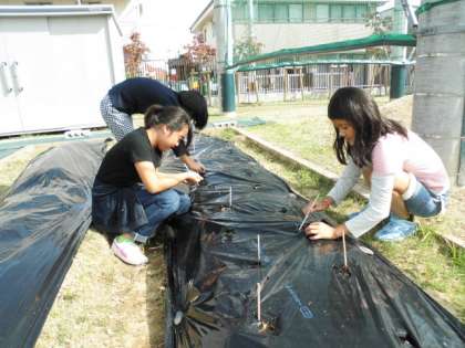 お昼休みの時間をつかって栽培委員会の子どもが、大根の種を学習園のコーナーにまきました。