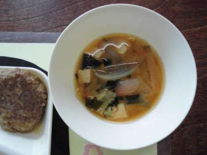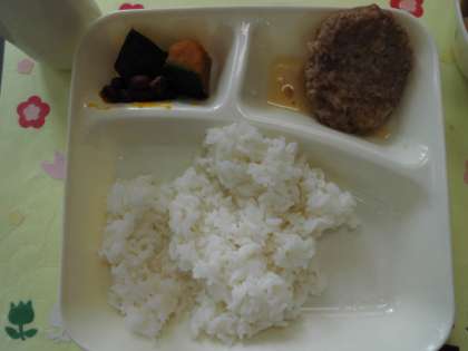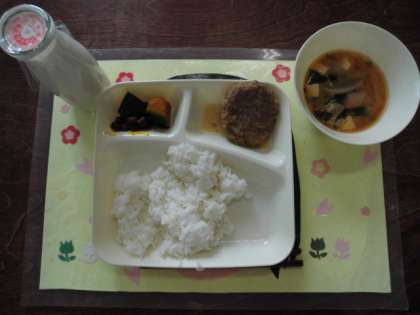 献立は、和風おろしハンバーグ、みそ汁、かぼちゃのいとこ煮、ごはん、牛乳でした。