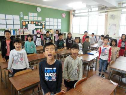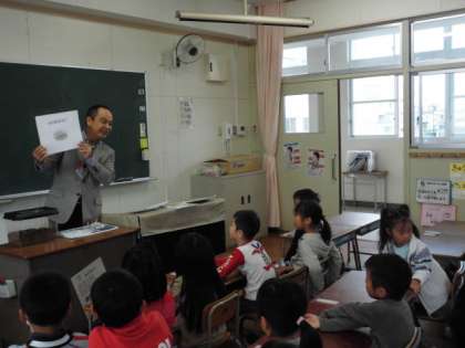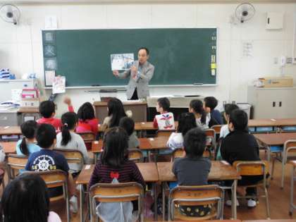 今朝は、校長が1年2組へ「かぶとむしは どこ ? 」という絵本を紙芝居仕立てにしたものの読み聞かせに行きました。