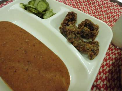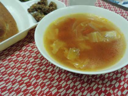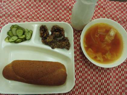 献立は、ミラノ風カツレツ、ミネストローネ、きゅうりのサラダ、パン、牛乳でした。