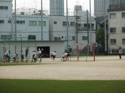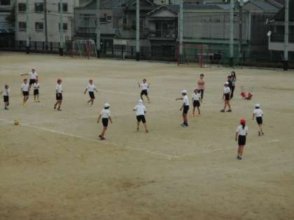防球ネットに向かって、ボールを投げる練習をしてから、ドッジボールに盛り上がっていました。