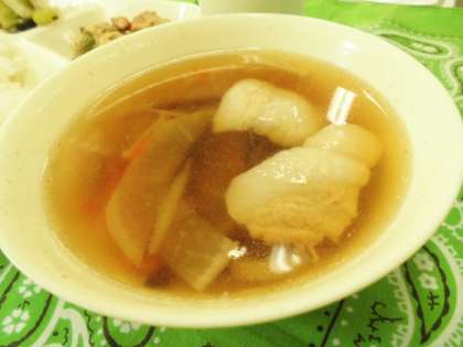 ソーキ汁は、沖縄県の郷土料理です。沖縄のことばで豚のあばらの骨付き肉をソーキといい、それをつかった汁物のことです。この汁に沖縄そばを入れたソーキそばも有名です。給食では、豚の三枚肉(ばら肉)を使用しています。豚肉からいい出汁が出て、こくもあり、とてもおいしくいただきました。