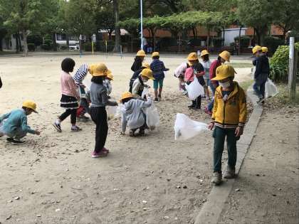 1年生が生活科の学習で落ち葉を拾いに行きました。