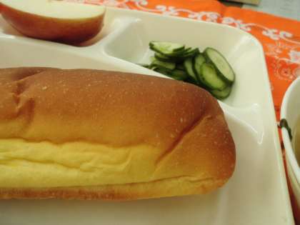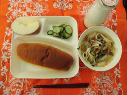 献立は、肉うどん、あっさりきゅうり、りんご、パンプキンパン、牛乳でした。