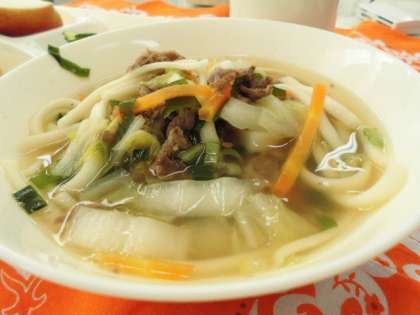 肉うどんは、だしににんじん、はくさいの順に加えて煮、さらに煮あがった段階でかまぼこを加えて味付けし、最後にうどん、あらかじめ調理していた肉、青ネギを加えて煮ます。手作りの良さが味に出ており、一味もふた味も違うとてもおいしい肉うどんです。しっかりといただきました。