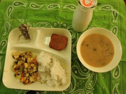 献立は、カツ丼、なめこのみそ汁、ミニフィッシュ、牛乳でした。
