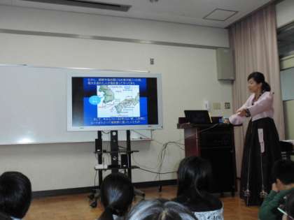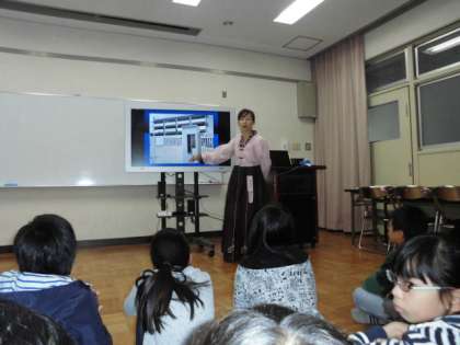 電子黒板に映しだされた映像とソムセンニムの話で、日本と朝鮮・韓国との関わりや歴史、地名、コリアタウンのことについて知るとともにフィールドワークへの期待感が高まっているようでした。