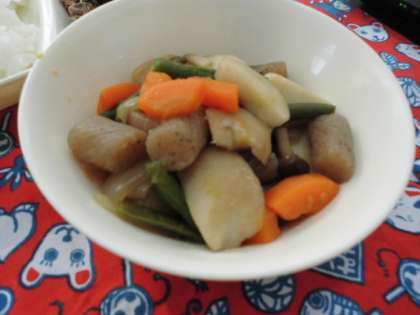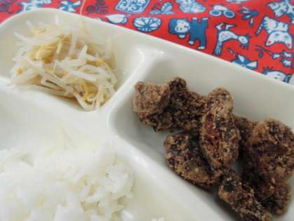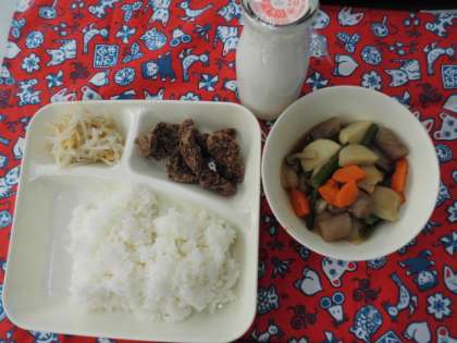 献立は、くじらの竜田揚げ、さといもと野菜の煮物、もやしのゆずの香あえ、ごはん、牛乳でした。