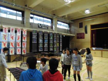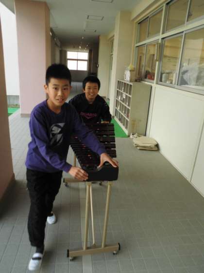 給食を早く食べ終えた6年生が、楽器を作品展の終わった講堂に搬入していました。
