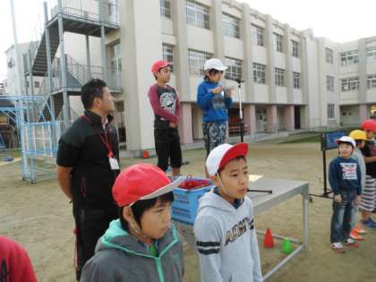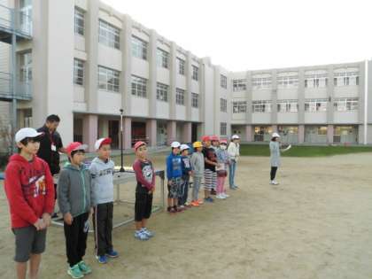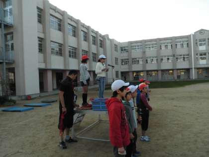 10分間の活動時間が終わり、まだまだしたそうな子どもたちでしたが、元の隊形に集まって運動委員会からのお知らせや今日の大縄跳の感想を聞かれたりしていました。