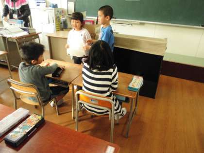 2組では、前に出た児童が一言メッセージを述べた後、質問に答えていました。