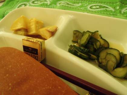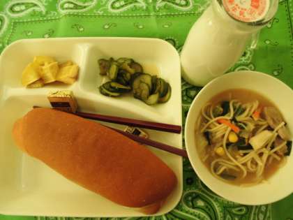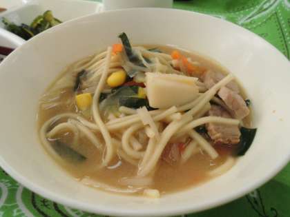 あったかい具だくさんのラーメンとおかず、バターをパンにつけておいしくいただきました。