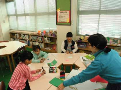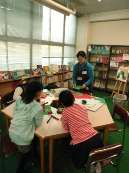 図書館では、図書館支援員の昌山さんが、子どもたちのクリスマスカード作りを手伝っていました。