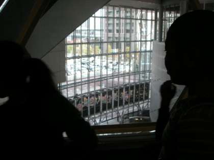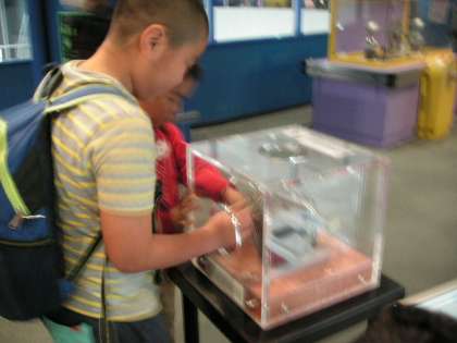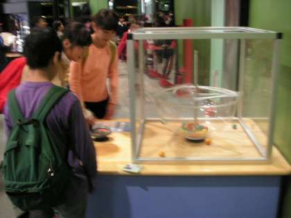見学、活動時間を守って1階まで いろいろな物を回したり、ボタンを押したりしながら、科学的なミニ体験をしました。その後、研修室にて他校の人たちも一緒に昼食をグループで座っていただきました。