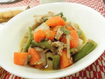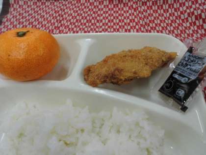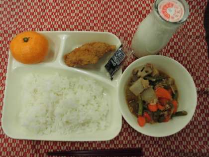 献立は、まぐろのフライ、豚肉とだいこんの煮物、みかん、ごはん、牛乳でした。