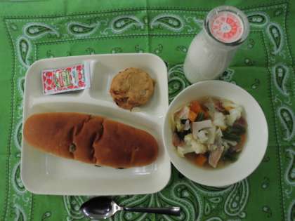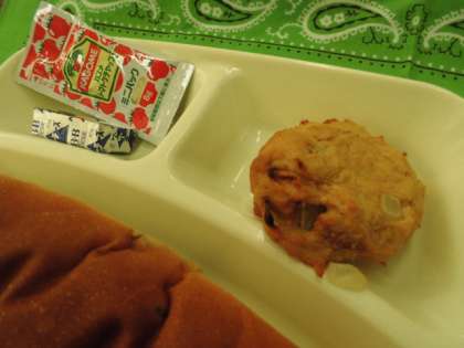 献立は、とうふハンバーグ、スープ煮、固形チーズ、パン、牛乳でした。