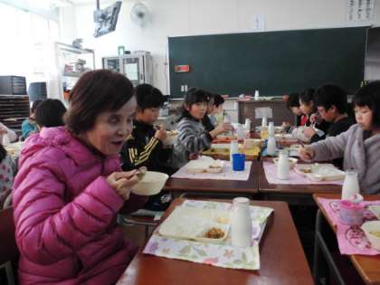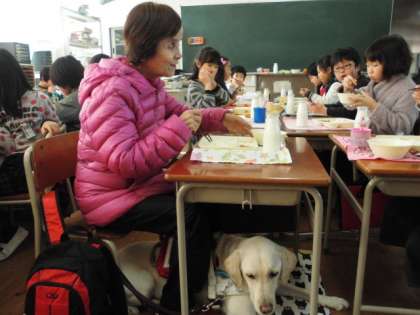 ○多目的室で3・4時間目学習後、教室に戻り3年生のみんなと一緒に給食を山本先生と 食べました。山本先生もメニューを聞きながら、味わっておいしく食べてくださいました。食事中は フェリシアさんも盲導犬として教えられた通り静かにおとなしく待っている様子も見せていただきました。