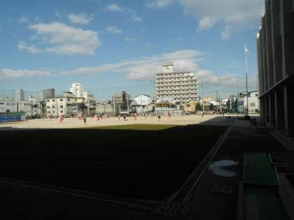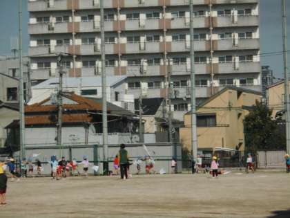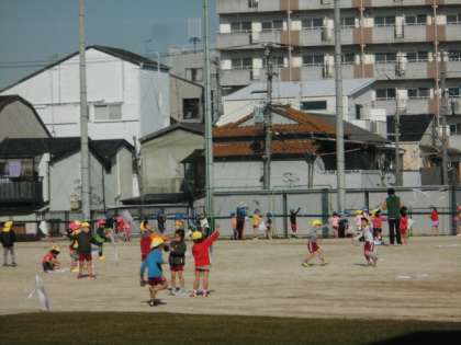 東桃谷幼児の園の園児たちが、本校運動場いっぱいに広がって凧揚げをしていました。
