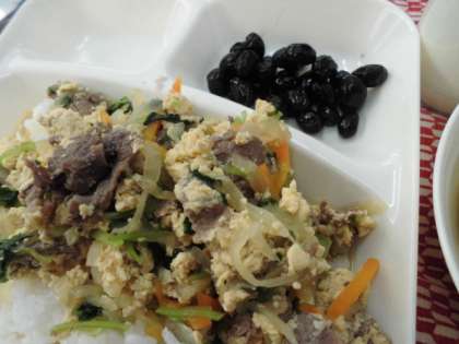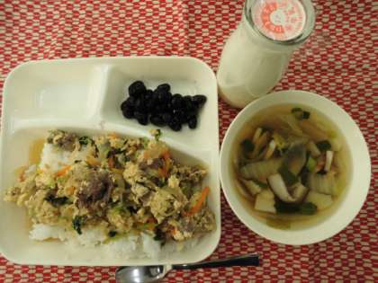 献立は、他人丼、すまし汁、黒豆の煮物、牛乳でした。
