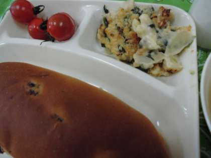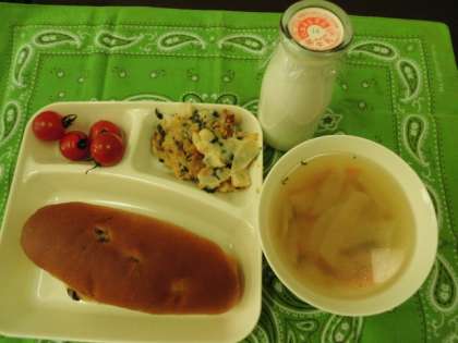 献立は、ほたて貝のグラタン、だいこんのスープ、プチトマト、レーズンパン、牛乳でした。