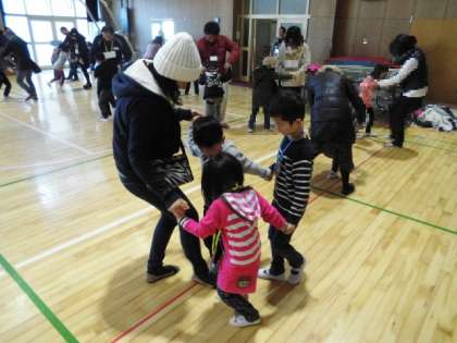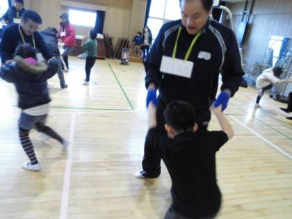 子どもたちと保護者でペアを作り、ペアを変えながらPA(プロジェクト・アドベンチャー)活動を楽しんでいました。