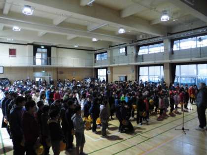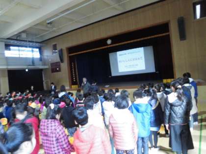 避難訓練について、校長、生活指導担当からの話の後、講堂で防災についての学習会を行いました。